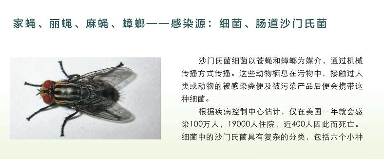 家蝉、丽蝇、麻蝇、蟑螂-- 感染源:细菌、肠道沙门氏菌